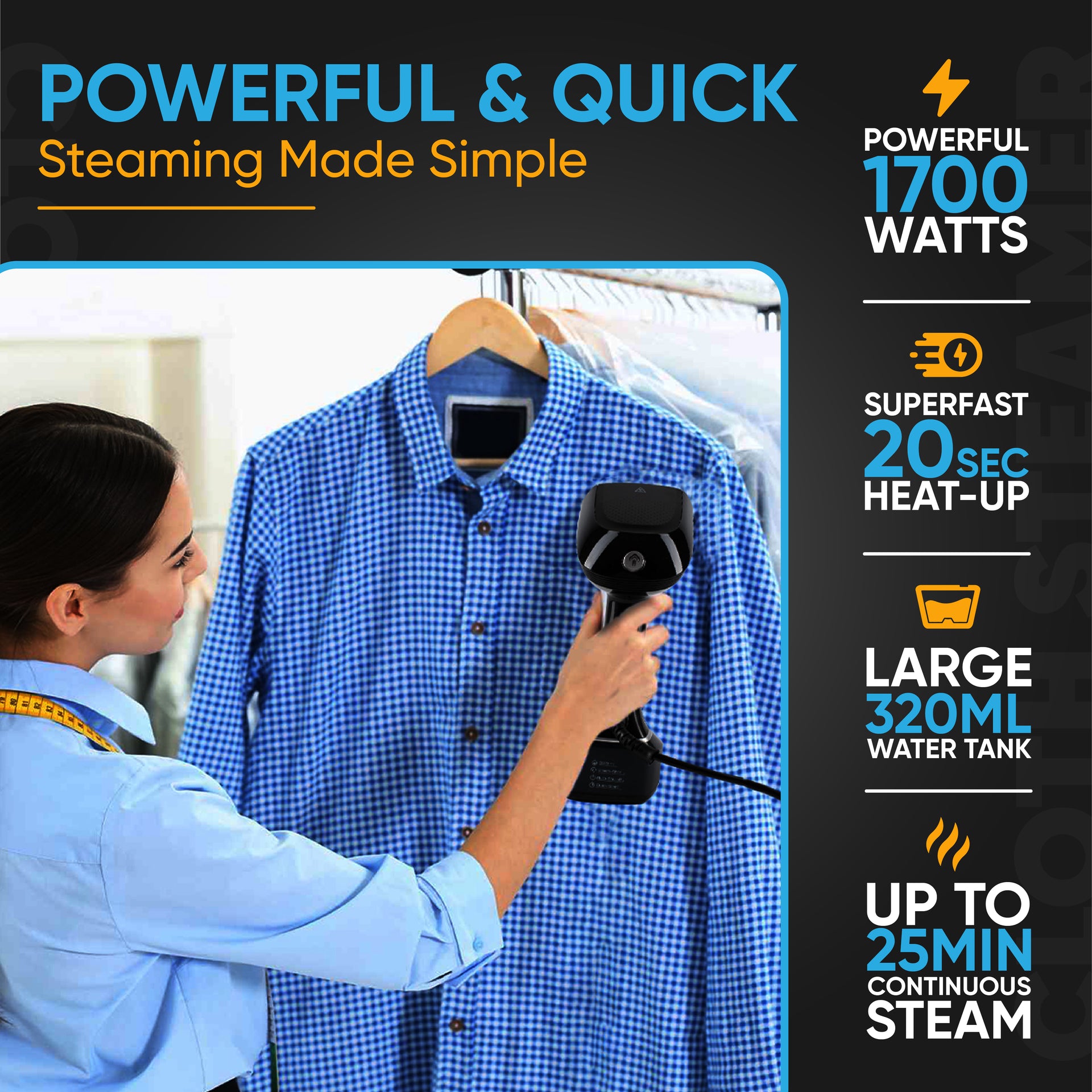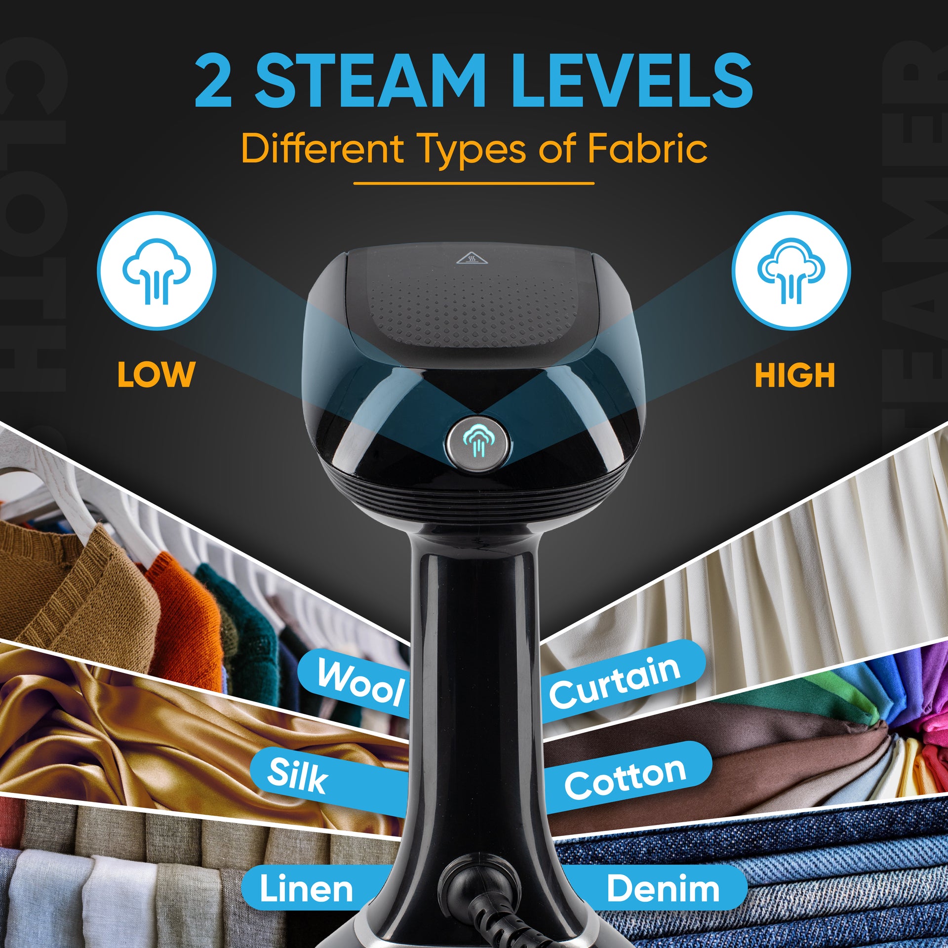 [1700W Power, Two Steam Levels] Experience smooth, wrinkle-free clothes with our powerful 1700W handheld clothes steamer, with two steam levels. Effortlessly remove creases from clothes, curtains, and fabrics in a matter of minutes with no spitting.a