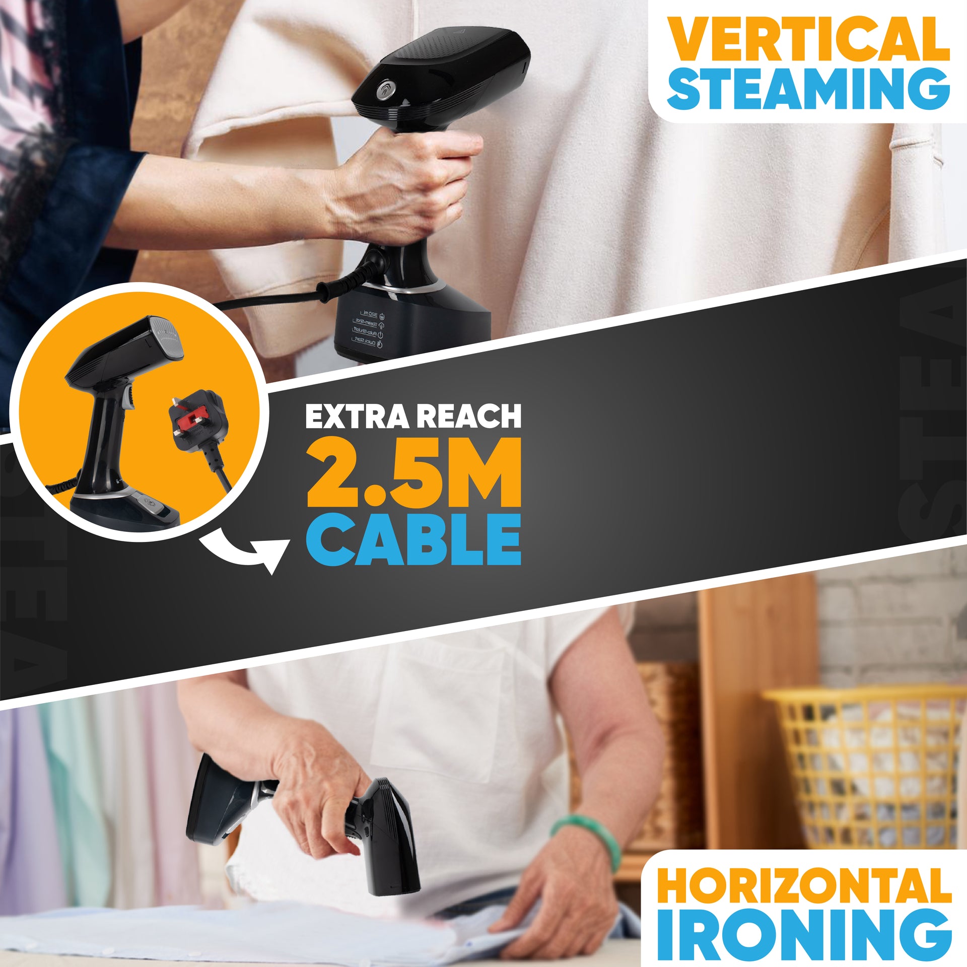[Extra-long 2.5m cable] At over 8 feet, the extra-long cable provides greater reach and convenience allowing for flexible vertical and horizontal steaming.